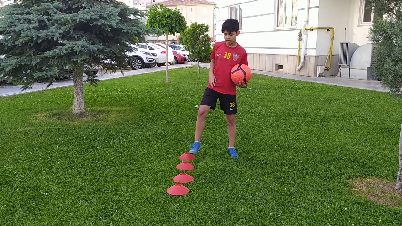 Evde veya bahçede aralıklı koyulmuş 4–5 koni (örnek olarak su şişesi) arasında top sürme.